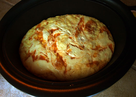 - Blend whipped egg whites into the milk / bread mixture and pour into greased crockpot.