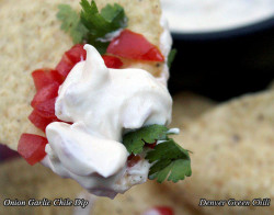 I love caramelized onions with that sweet, rich taste – and you get an interesting, robust flavor when you add fresh garlic and green chiles. So I thought I’d make a special version of the classic onion dip made with sour cream and onion soup mix. Very nice result – it has a distinctly fresher taste. I made this on the light side, with relatively little green chile and onion soup mix; it was much lower salt and medium hot.