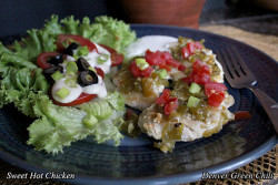Like sweet and sour chicken? Well, this is a version of it. It’s a simple recipe – just a sauce with a half dozen ingredients and seared chicken cutlets. If you make it with mild chiles, you get sweet and sour chicken (with a lumpy green sauce). I made this with Southwestern 505 chiles, which are medium hot to hot, so you don’t really notice the sour part – it’s more of a sweet-hot than sweet-sour. Just adjust the heat with your choice of chiles. You can also make this sauce, refrigerate it and serve it on other meats or fish as you wish. It will also freeze well.