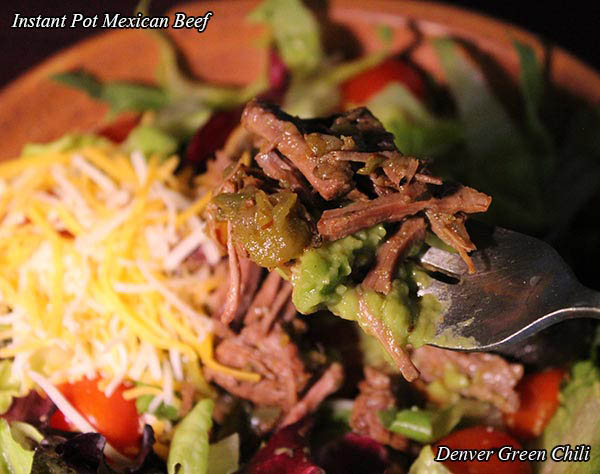 When this beef was done, I shredded it up with 2 forks and it was so tender it fell apart. Right away I made tacos and burritos with it. The next day, I put it in a salad with lettuce, tomatoes, shredded cheese, and guacamole (as in the photo). Nice Southwestern flavor, not too spicy. If you want it spicier, just use hot chili powder, hotter green chiles, or increase the amount of one or both. The next time I make it, I'll probably make a double batch, pack it up in 1-lb bags and freeze it. Of course, I'll have to double the cooking time. This is so versatile, it's worth having extras in the freezer.