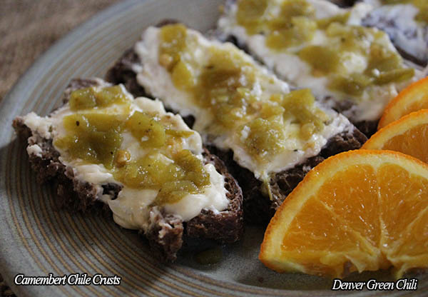Bottom line, I had a big loaf of pumpernickel from Trader Joe’s Dark Pumpernickel. (I love pumpernickel, especially made into a reuben sandwich). I also had a chunk of this creamy Le Delice de Bourgogne and a smaller wedge of camembert. For days, I kept grabbing a piece of pumpernickel, spreading it with this awesome cheese (both kinds) and chowing down on this gourmet snack. After maybe 50,000 calories of this, it hit me – I had some 505 Green Chile in the fridge that would be great on this. And the chile made it even better! And it can’t get simpler – grab bread, spread cheese, a bit of chiles on top – enjoy!