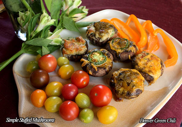 Having a party? Want an easy, yet elegant appetizer? Can’t beat this. The basics are simple: Mushroom caps filled with shredded cheese and maybe some pico de gallo. Top some with a slice of fresh jalapeno. And here’s what I think makes it really memorable – just top it with a bit of 505 Sweet ‘N Spicy Salsa. I just really like that touch of sweet, and this particular salsa has been growing on me. The more I cook with it, the more I appreciate its balance of hot and sweet – just right. Note some of these mushrooms have a slice (a circle) of jalapeno on top, also a really nice accent. I also topped some with medium diced green chiles for a more traditional version.