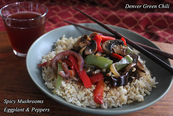 I love spicy Thai vegetables, so here I made a combination of my favorite veggies with a classic combination of Thai spices and sauces. It turned out to be a fabulous dish. It started out mainly mushrooms, but then mushrooms cook down to almost nothing so there's more of a balance of vegetables. Here I just served it on brown rice. I would also make this with chunks or strips of chicken or beef in it. This basic dish is one I'll be trying different veggies in over and over - it's simple and always good.