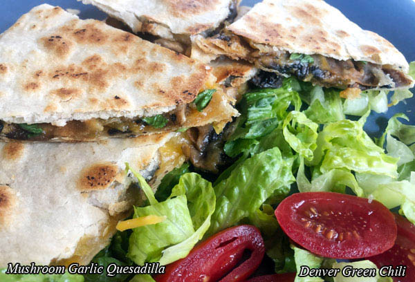 This is a yummy combination of mushrooms, garlic and chiles sauteed in butter and cooked up between two tortillas and shredded cheese. I ate the whole thing for breakfast. It is not low-cal. It occurred to me that this exact recipe would also make a great omelette - just cook up 2-3 beaten eggs in a skillet, top with shredded cheese and the mushroom mixture, and fold over.